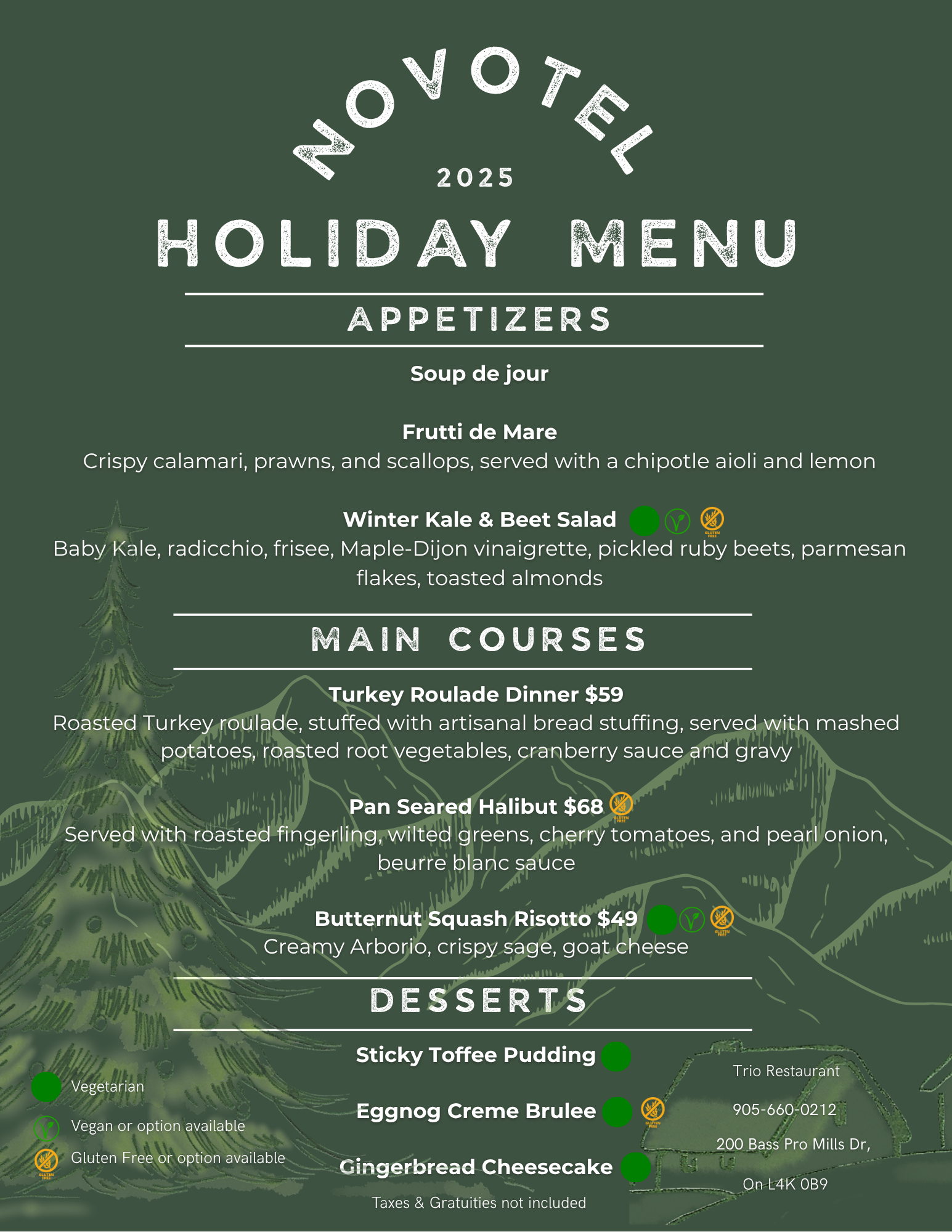 Inspired by the rich diversity of Toronto and Canada in general, Trio Restaurant at Novotel Toronto Vaughan offers beautiful food in the heart of Vaughan.