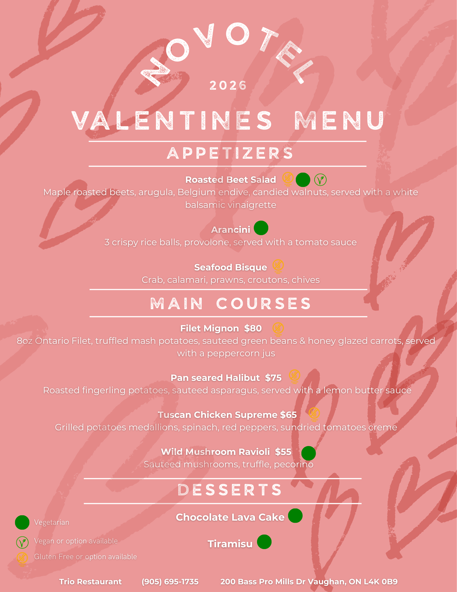 Our special Valentine’s Day menu will be available February 13 for dinner only, and February 14–15 for both lunch and dinner at Trio Restaurant.